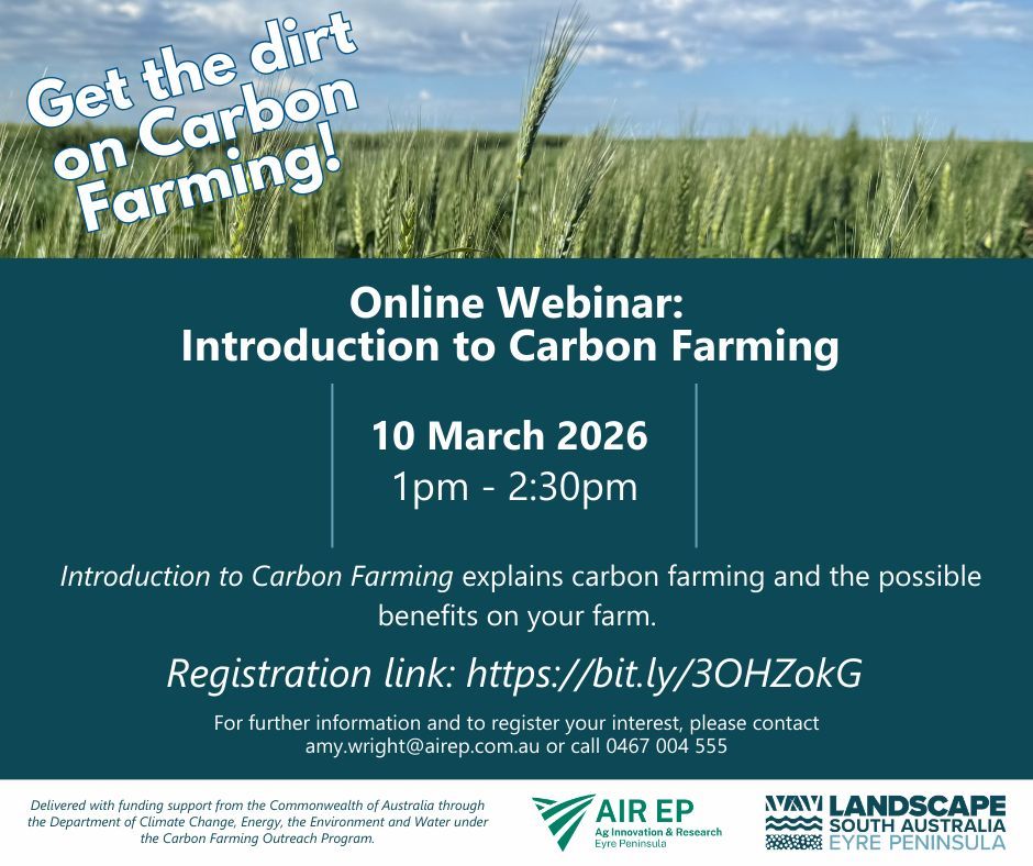 🌱Get the dirt on Carbon Farming | Tuesday 10 March 2026 | 1–2:30pm 🌱 Find out how carbon farming could complement your agricultural practices & benefit your business 👉🏻 Simply register here https://bit.ly/3OHZokG#carbonfarming #eplandscapeboard