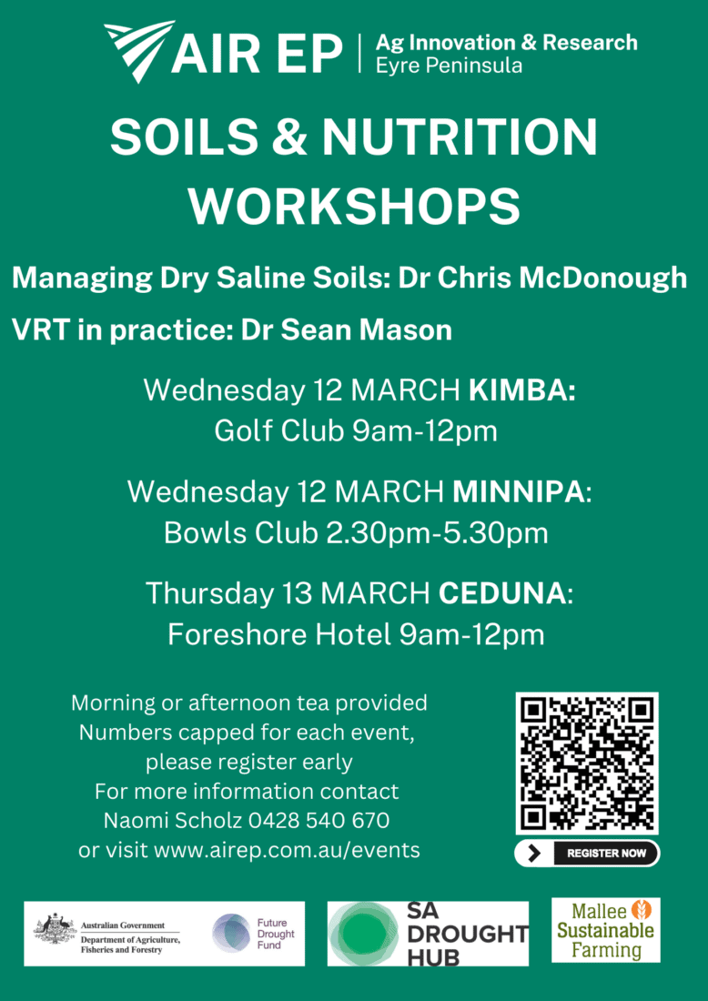 Don’t miss our free workshops next week, with an exciting double billing of Dr Chris McDonough, who will provide the tools to manage dry saline or ‘magnesia’ patches and Dr Sean Mason, who will demystify VRT and soil nutrition.