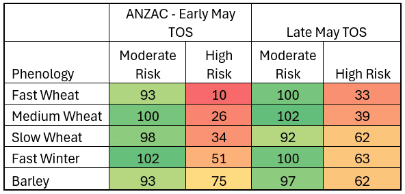 Table 1: 2022-24 grain yields expressed as a % of a medium phenology wheat (eg Scepter) yield. Variety phenology x time of sowing (TOS) in two different frost risk zones at Tooligie.
