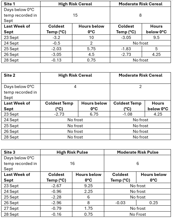 Table 2: Temperature data and hours below zero degrees Celsius recorded during critical flowering periods from the three different trial sites in the Tooligie area in 2025.