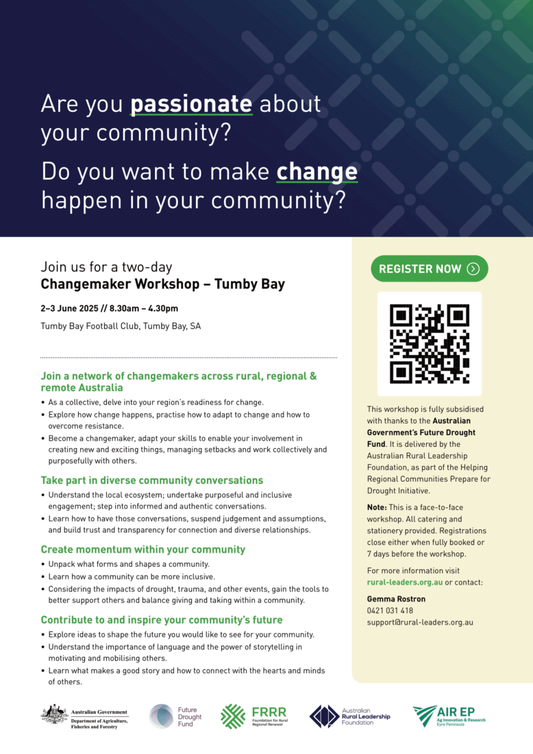 In addition, registrations will soon open for Changemaker workshops coming to Cummins on 5-6 June, Streaky Bay on 19-20 June, and Wudinna on 23-24 June 2025. Be sure to remain updated via our AIR EP social media pages Facebook, Instagram and X (Twitter).