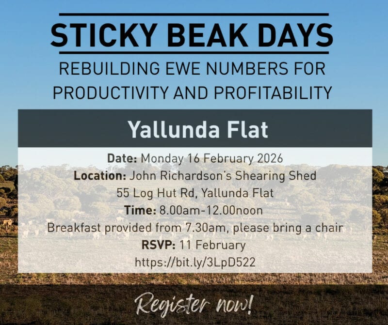 The AWI Extension SA Sticky Beak Days are supported by the Australian Government through funding from the Natural Heritage Trust under the Climate-Smart Agriculture Program and delivered for the Northern and Yorke Landscape Board, a member of the Commonwealth Regional Delivery Partners panel; SA Sheep Industry Panel; South Australian Government’s $73 million Drought Support Package, eID Advantage Program and the Eyre Peninsula Landscape Board with funding from South Australian Government’s Landscape Priorities Fund; and Australian Wool Innovation.