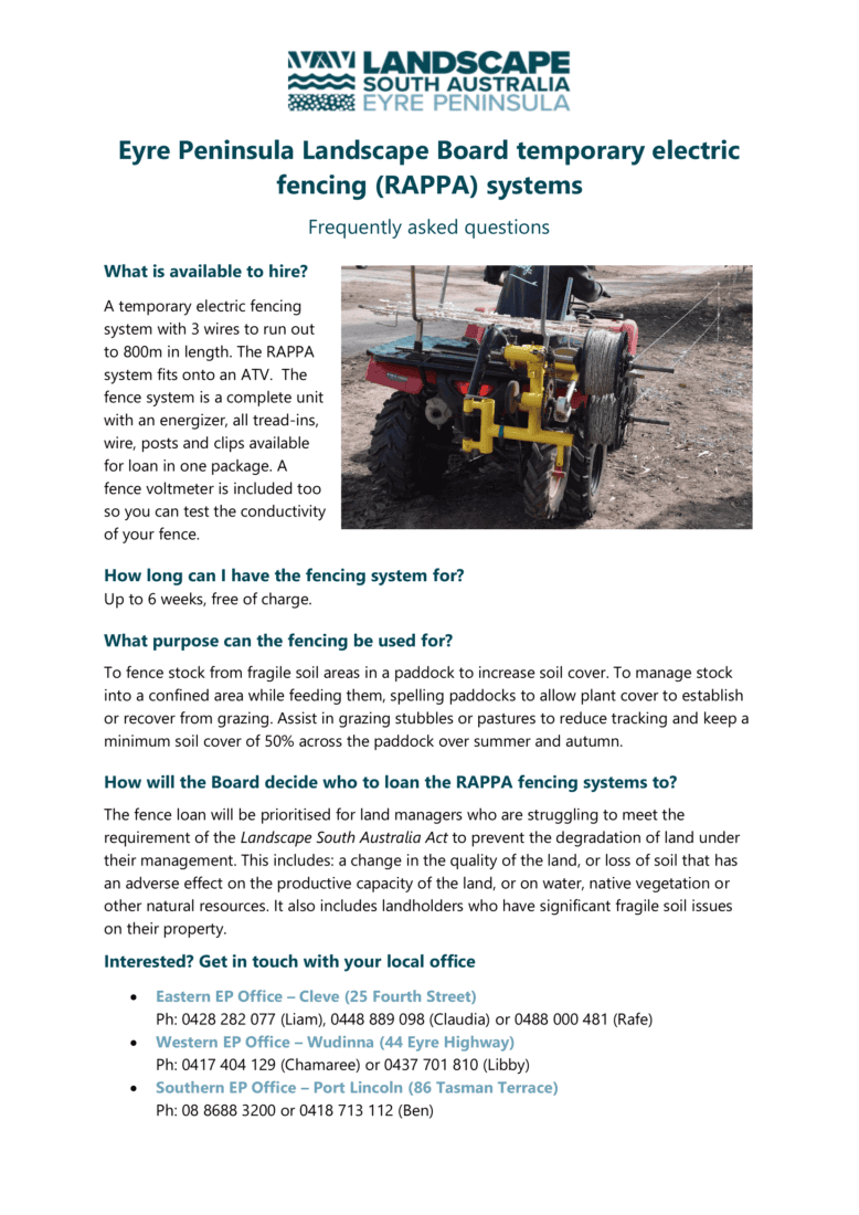To help landholders with managing erosion-prone areas, the Eyre Peninsula Landscape Board has four RAPPA electric fencing units available for loan from its Cleve, Wudinna and Port Lincoln offices.
