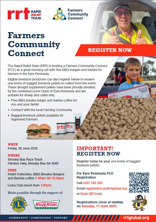 RRT (Rapid Relief Team Australia) is fast-tracking another Farmers Community Connect Day, to be held in Streaky Bay on Friday, 20 June 2025, from 7:00am to 1:00pm.