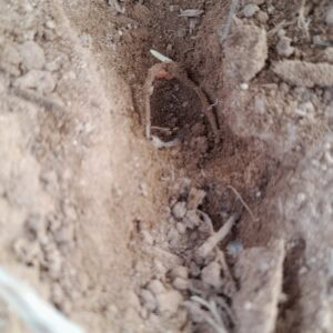 Figure 2. Germinating seed of Tomahawk wheat sown at 75 kg/ha at 2cm deep at the Poochera trial site, photo taken on 11 June 2025.