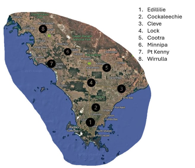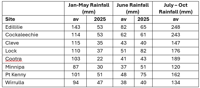 Table 1: Historical average and 2025 actual rainfall (mm) for eight locations across Eyre Peninsula.