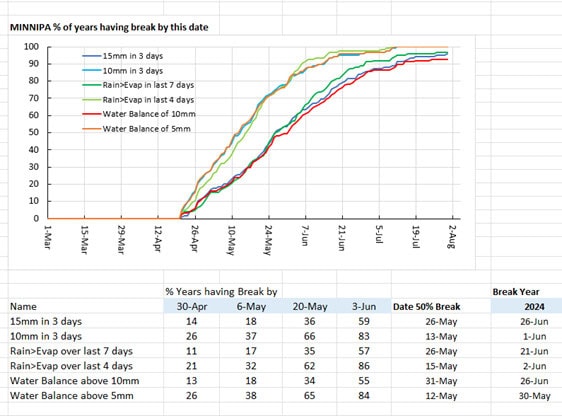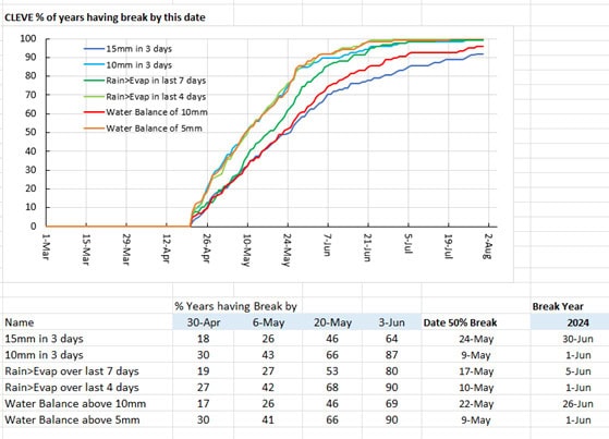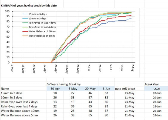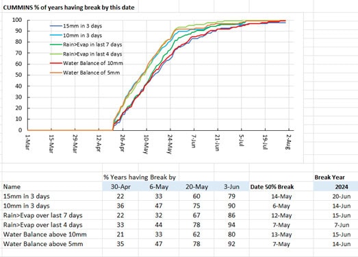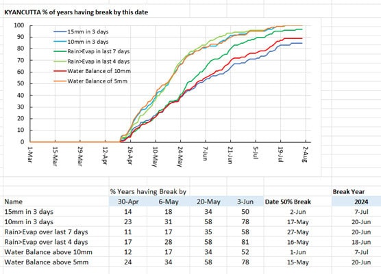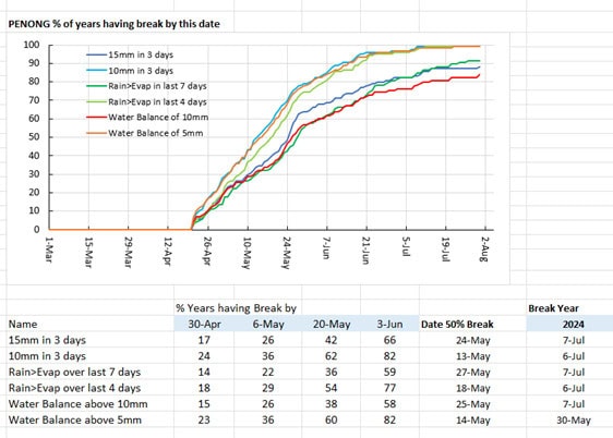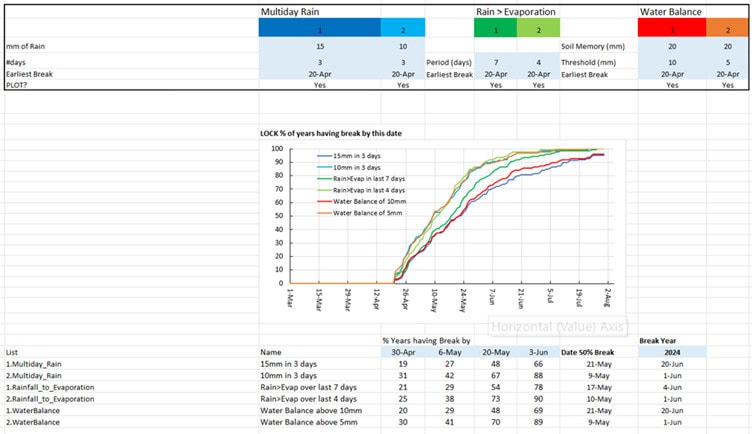 In 2024, after a long wait growers received 7.5 mm on 31 May and 2 mm on 1 June, followed up with 11 mm over 14-15 June. Th e final column in the screen grab above shows that the rules that included evaporation identified the end of May or early June break in 2024. In this location, the rules using 15 mm or 10 mm in 3 days missed out.