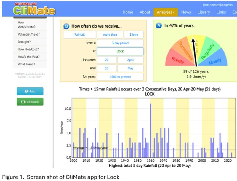 Search for “CliMate App” to find an easy way to check how often a location has received X mm of rain over Y days (Figure 1). Both the amount of rain and the number of days can be adjusted by the user. The user can also set the dates and the historical period.  Figure 1 shows that if we use the long-term record, a grower at Lock can expect 15 mm in 3 days between 20 April and 20 May about half the time. The CliMate App is based on feedback from many growers and advisers. It is well designed and can be used to answer most climate related questions.
