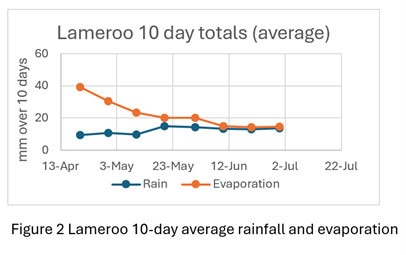 From late April to June, the average rainfall increases and evaporation decreases (Figure 2.) The drop in evaporation is typically greater than the increase in rainfall.  Figure 2 shows that at Lameroo, the average 10-day rainfall increases from about 9mm in the later half of April to about 15mm in mid-May to the end of June.  Over the same period, the 10-day evaporation decreases from about 40mm to 15mm.  The year-to-year variability in evaporation for any 10- day period is relatively minor compared to the enormous range in rainfall experienced from year-to-year. One way of measuring the range is to divide the difference between decile 9 and decile 1 by decile 5. Using long term records for the 10 days ending on 20 May at Lameroo, this value is 40% for evaporation and 300% for rainfall.  The actual numbers will be different for other locations, but the much greater changes in evaporation compared to rainfall is likely to be similar.