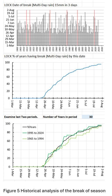 A common question is whether the break of season is getting later. The SARDI sowing rule spreadsheet includes a number of ways of looking at this for each of the six user-defined rules. The top graph in Figure 5 is a simple time series of the date of receiving 10 mm in 3 days at Lock.  Using this rule, there was a bad run of late breaks in the late 1930s and there was good run in the early 2000s. There is no clear trend. The bottom graph compares the recent 30-year period 1995 to 2024 with the previous 30-year period 1965 to 1994. Using this rule, the curve for the latter period is slightly shifted to the right which suggests later breaks. Although there is a general trend towards drier conditions with higher evaporation, the shifts in the date of the break depends on the rule used and the periods being compared.